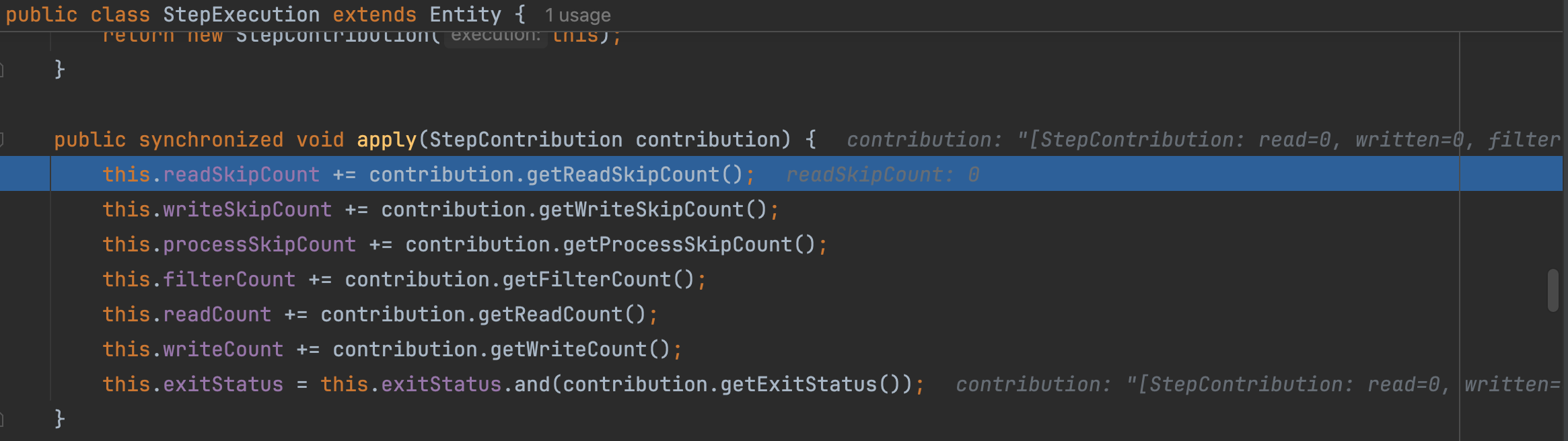 - Step이 종료되는 마지막 시점에 StepContribution에 저장된 값들을 StepExecution의 `apply` 메서드를 호출해 StepExecution에 최종적으로 업데이트하게 된다.