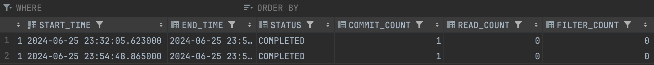 Job에는 Step이 2개로 구성되어 있어 StepExecution은 두 개가 생성되었고, 모두 성공적으로 수행되었다.