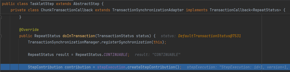 package io.spring.batch.helloworld.ch3.stepContribution; import lombok.RequiredArgsConstructor; import org.springframework.batch.core.Job; import org.springframework.batch.core.Step; import org.springframework.batch.core.StepContribution; import org.springframework.batch.core.configuration.annotation.JobBuilderFactory; import org.springframework.batch.core.configuration.annotation.StepBuilderFactory; import org.springframework.batch.core.scope.context.ChunkContext; import org.springframework.batch.core.step.tasklet.Tasklet; import org.springframework.batch.repeat.RepeatStatus; import org.springframework.context.annotation.Bean; import org.springframework.context.annotation.Configuration; @Configuration @RequiredArgsConstructor public class StepContributionConfiguration { private final JobBuilderFactory jobBuilderFactory; private final StepBuilderFactory stepBuilderFactory; @Bean public Job stepContributionJob() { return jobBuilderFactory.get("stepContributionJob") .start(step1()) .next(step2()) .build(); } @Bean public Step step1() { return stepBuilderFactory.get("step1") .tasklet(new Tasklet() { @Override public RepeatStatus execute(StepContribution stepContribution, ChunkContext chunkContext) throws Exception { System.out.println(">> STEP1 EXECUTIONED"); return RepeatStatus.FINISHED; } }).build(); } @Bean public Step step2() { return stepBuilderFactory.get("step2") .tasklet(new Tasklet() { @Override public RepeatStatus execute(StepContribution stepContribution, ChunkContext chunkContext) throws Exception { System.out.println(">> STEP2 EXECUTIONED"); return RepeatStatus.FINISHED; } }).build(); } }StepContribution 프로세스를 알아보기 위해 디버깅으로 TaskletStep부터 시작해보았다.