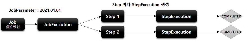 - Step의 StepExecution이 모두 정상적으로 완료되어야 JobExecution이 정상적으로 완료된다.